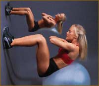 Исходное положение здесь непростое. Надо лечь на мяч, а ступни упереть в стену. Руки скрещены на груди, кисти лежат на плечах. Сокращая пресс, подведите локти к коленям. Поначалу даже не пробуйте выполнить это упражнение самостоятельно. На мяче исключительно трудно сохранять равновесие, особенно, когда вы уже устали от первых двух упражнений. Попросите подругу или инструктора слегка "подпереть" вас. После каждого повтора, делайте паузу, стараясь "поймать" положение максимального равновесия, и только после этого начинайте следующий повтор.
